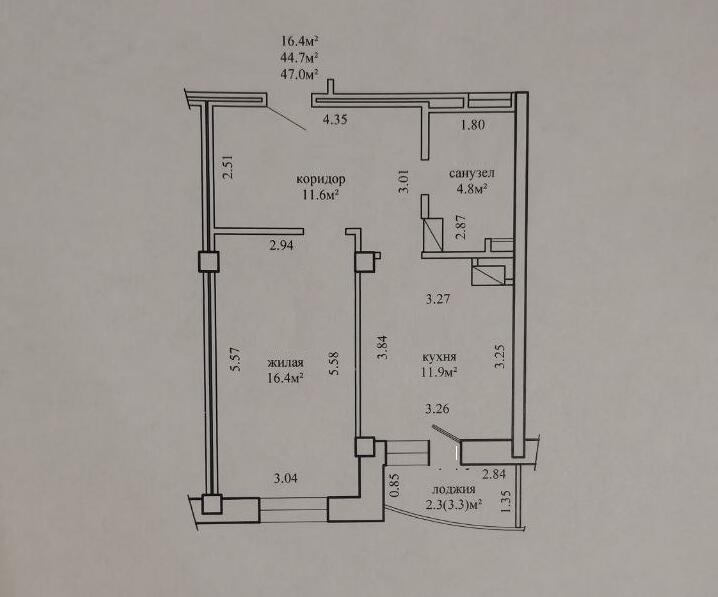 Площадь о/ж/к: 44.7 / 16.4 / 11.9 м²